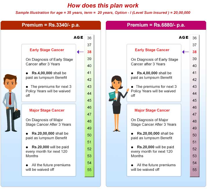 • Premium Waiver Benefit: All the Future premiums will be waived off on the diagnosis of specified Major Stage Cancer.