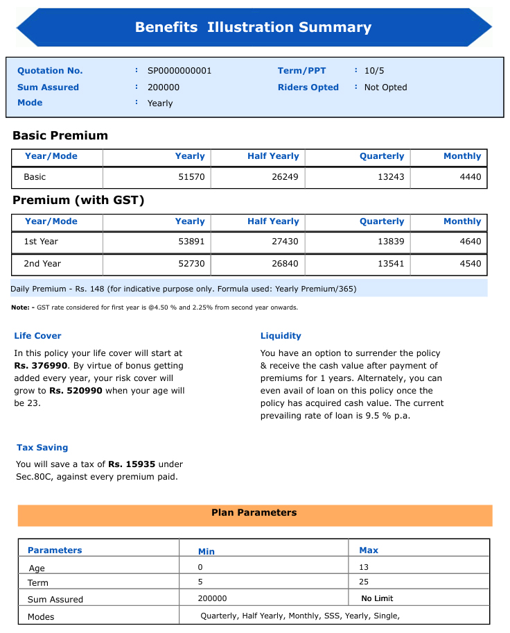• Tax Benefits: 1. Premium payments qualify for tax benefits under Section 80C of the Income Tax Act. 2. Maturity and death benefits are exempt under Section 10(10D).